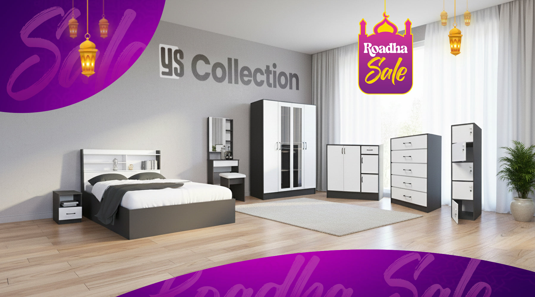 View full detailsYS Bedroom Set (4-Piece Set) Set Includes: • 1x Wardrobe (4 Door + 2 Mirror)• 1x Queen Bed• 1x Dressing Table (with Drawer + Chair + Cushion)• 1x ...