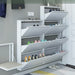 Keep your entryway neat and stylish with this sleek 4-tier wall-mounted shoe rack. Designed with a slim profile, it maximizes space while providing ample storage for your footwear. The crisp white finish complements any interior décor, making it a perfect fit for modern homes. Each compartment tilts open smoothly for easy access and can hold multiple pairs of shoes, keeping them organized and off the floor.