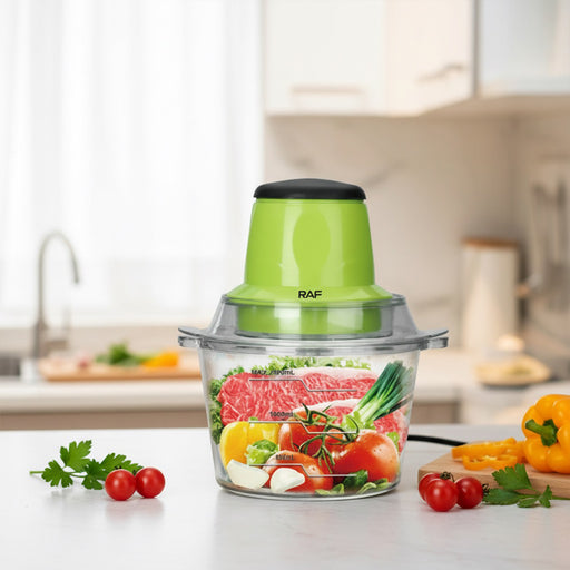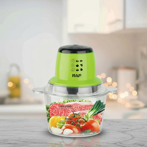 RAF Chopper R7003 Brand: RAFColor: GreenCapacity: 2LDimensions (W x D x H): 23 x 19 x 26cm A rack food processor can chop, mash, blend and chop a v...