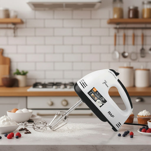 RAF Hand Mixer R6633 Brand: RAFColor: WhiteDimensions (W x D x H): 25 x 7 x 18cm This electric hand mixer freely shifts mixing speeds from speed 1...